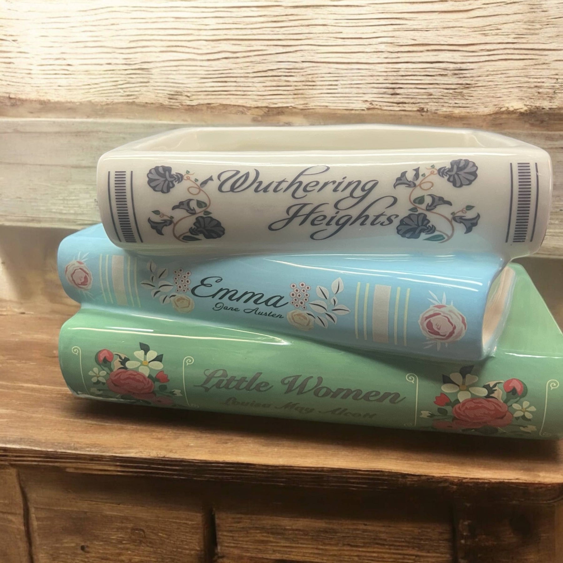 The Jane Austen Book Collection, Stacked Floral Vase, is an exquisite ceramic piece that artfully combines literature and decor. Its elegant design features graceful lines and a waved textbook appearance, resembling a charming stack of classic novels, including Wuthering Heights, Emma, and Little Women. This delightful vase serves as an ideal container for small floral arrangements, adding a touch of sophistication and literary flair to any space.