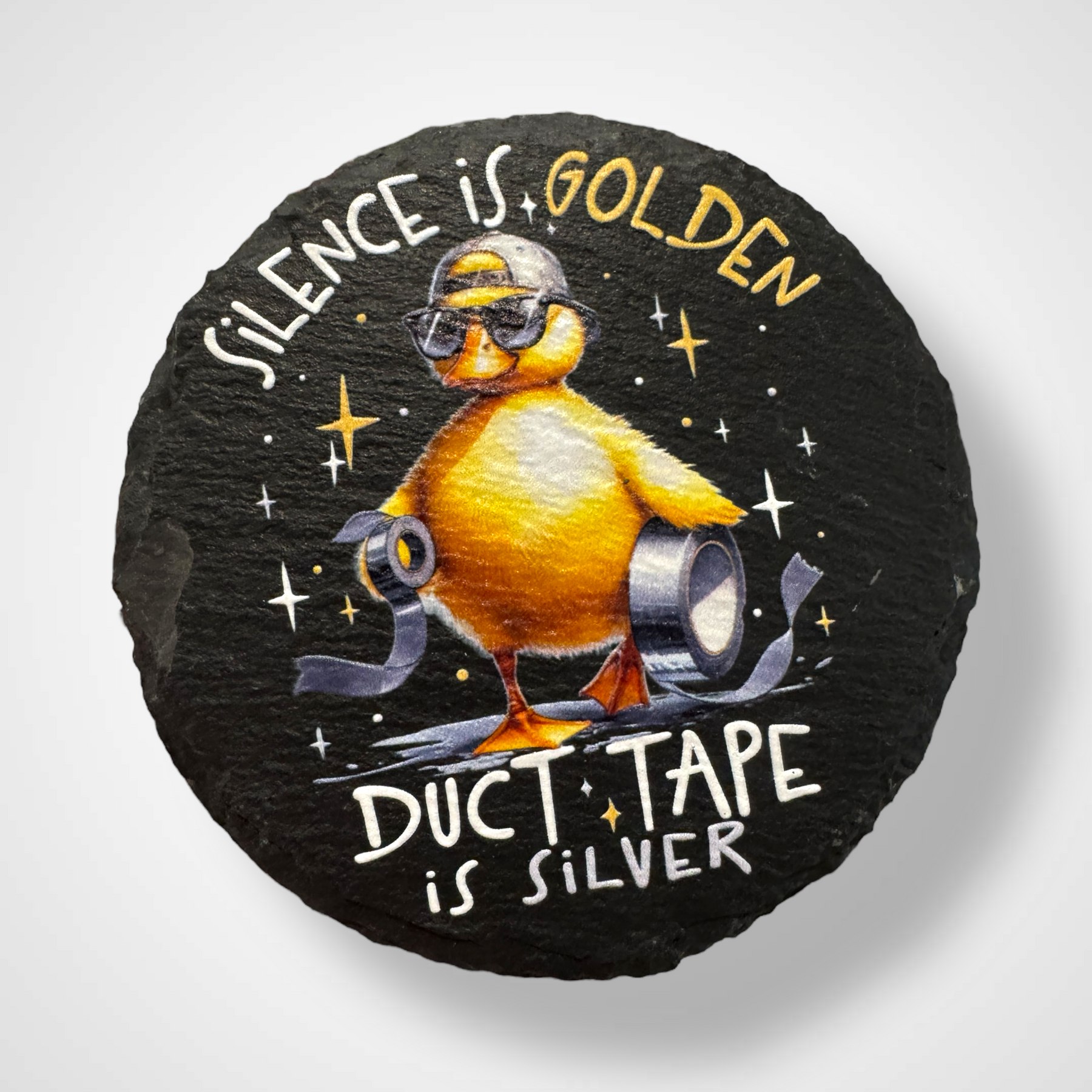 Bring a smile to any space with this playful slate coaster featuring the witty phrase, "Silence is Golden, Duct Tape is Silver." UV printed for vibrant, lasting detail, itās a fun gift that protects surfaces while sparking laughterāperfect for any ājust becauseā moment.