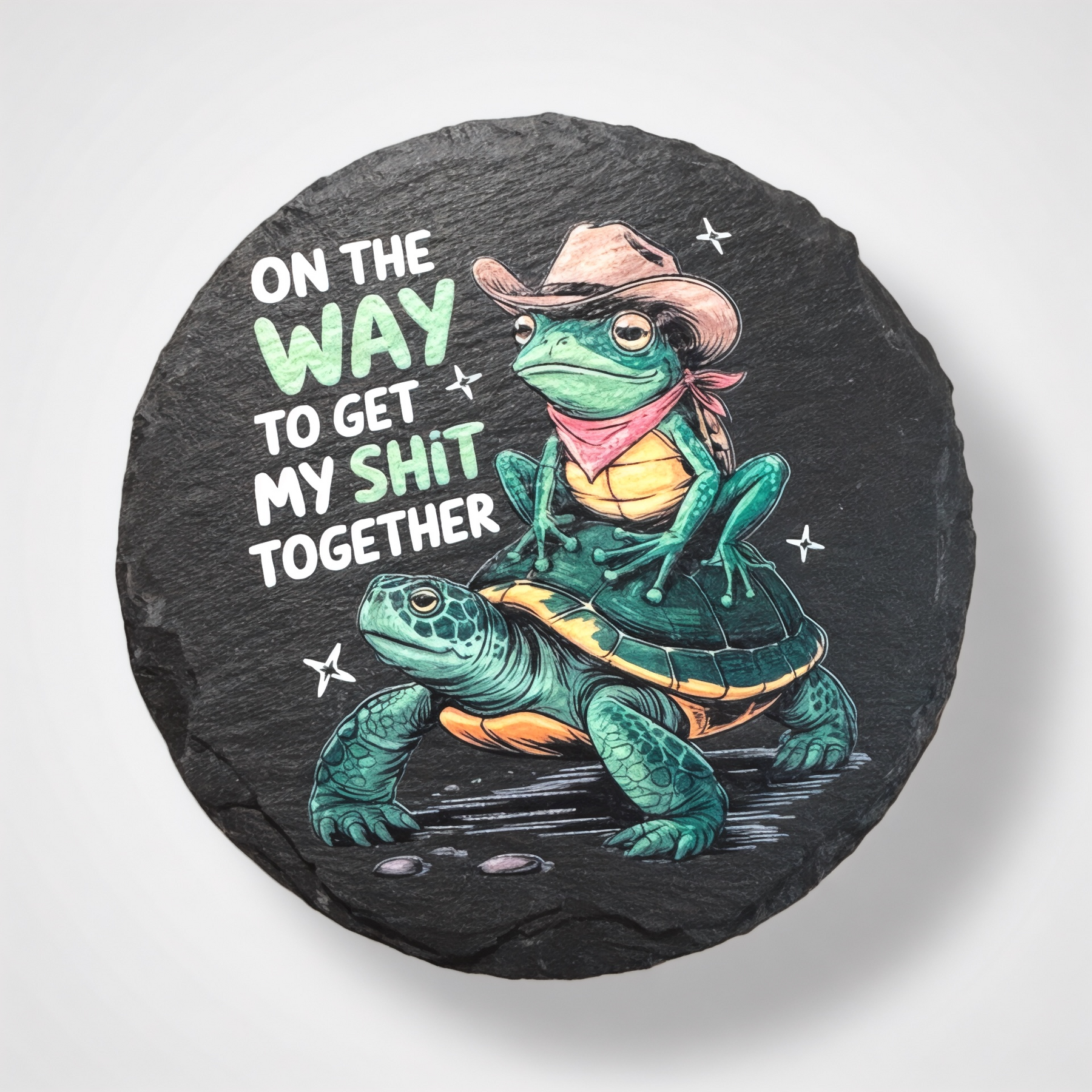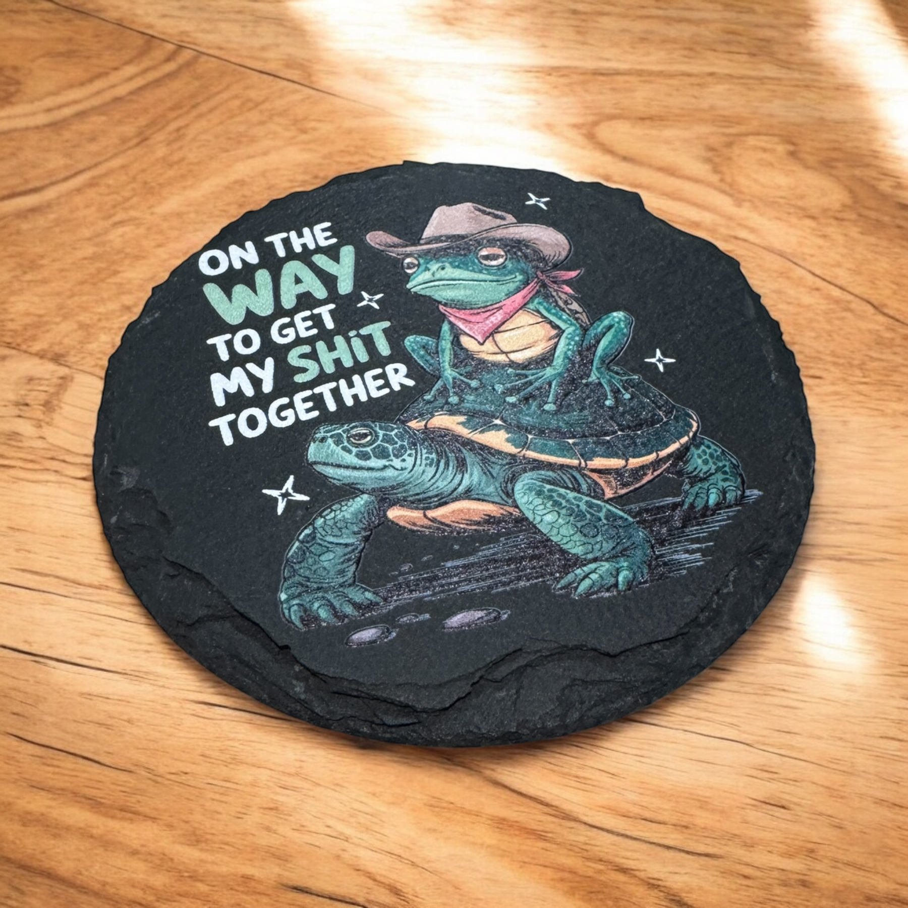 Add a splash of humor to your coffee break with the "On The Way" slate coaster. UV printed for vibrant, lasting color, this playful coaster keeps your surfaces safe while reminding you that getting your stuff together is a work in progress. Perfect for desks, coffee tables, or anywhere you need a little motivation with your morning brew.