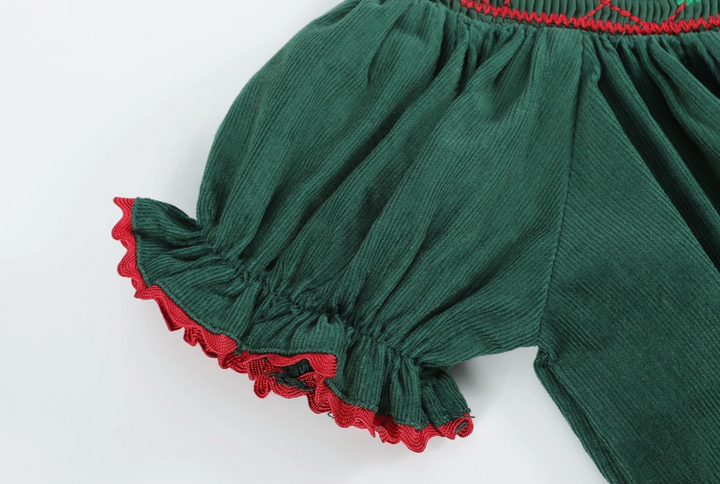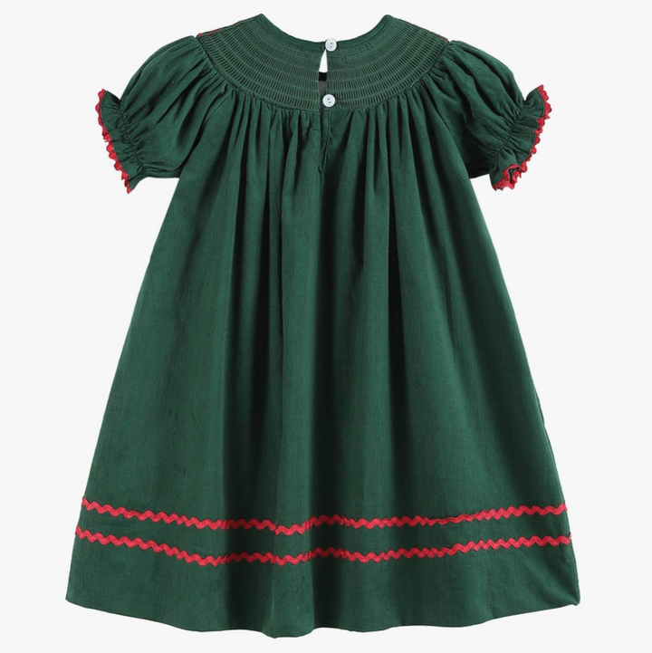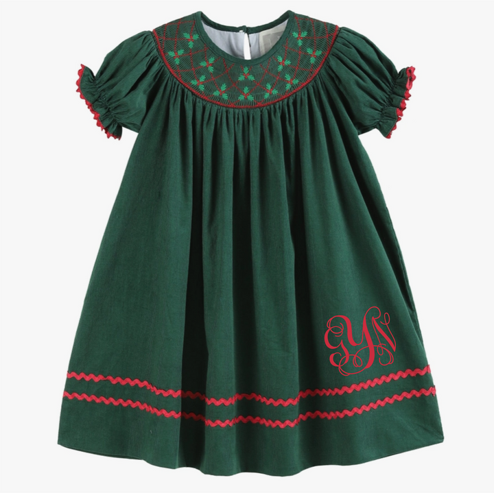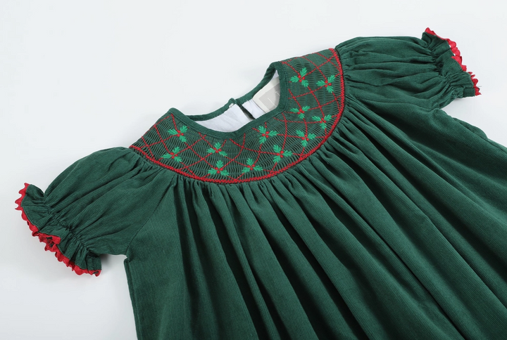 Stunning and Sweet! This beautiful green dress by Lil Cactus features pretty mistletoe embroidery, smocking, and red trim. Made in a 100% soft cotton ensure you little sweetie is comfortable all day long. This Bishop dress is the traditional length with hemline reaching the calf/ankle. A stunning outfit for your cutie and all of her christmas fun. From twirling and dancing the day away to holiday parties with family; no matter the occasion she will be looking picture-perfect!