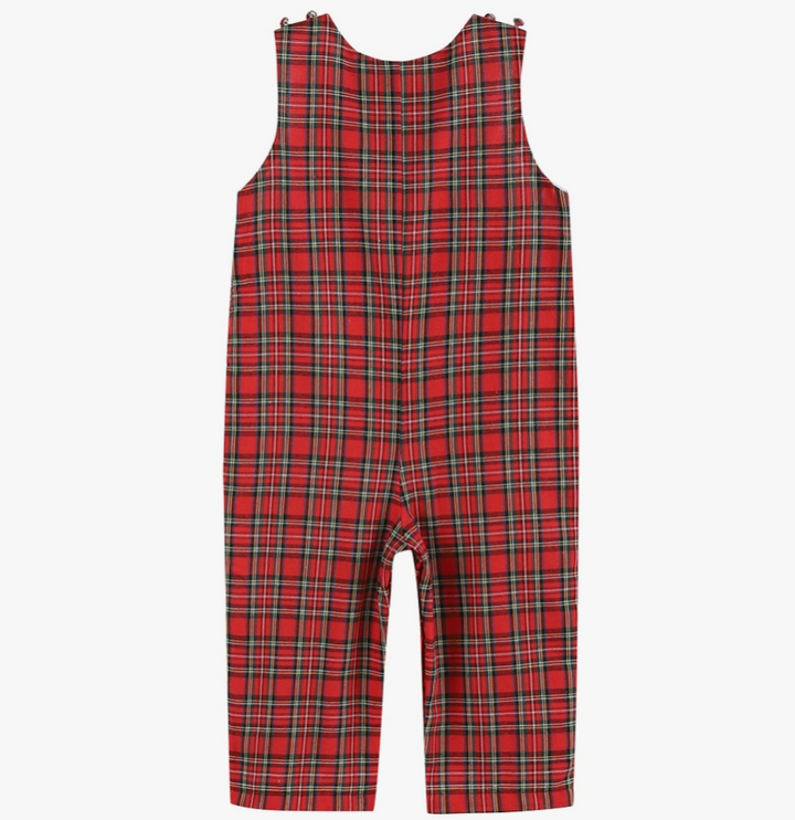 Merry and Bright! These Lil Cactus red Christmas plaid overalls are made in 100% soft cotton. They feature cute Santa and his sleigh embroidery, smocking, and snap enclosures for easy changing. The perfect outfit for your little guy and all of your winter fun. From pictures with Santa to the big Holiday meal; no matter the occasion he will be looking picture-perfect!