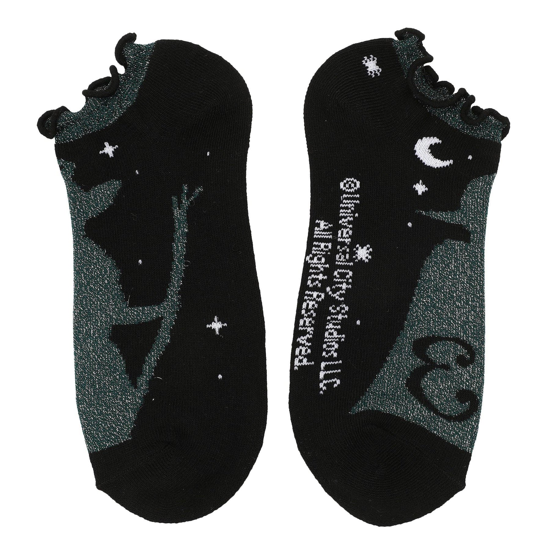 Add a touch of magic to your wardrobe with this 5-pair pack of women's Wicked ankle socks. Featuring vibrant designs of Elphaba, Glinda, and iconic symbols from the movie, these socks come in shades of black, green, and pink. They fit women's sock sizes 9-11 and shoe sizes 5-10. Made from a durable blend of 98% polyester and 2% spandex, they are machine washable on cold with like colors and can be tumble dried on low heat. Do not bleach.